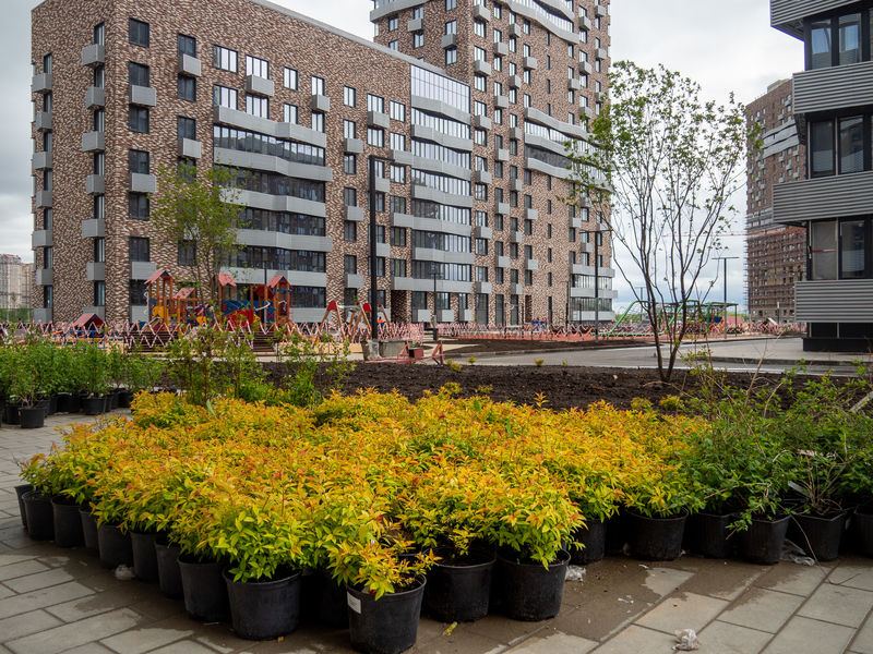 Активными темпами идет благоустройство придомовой территории. Завершается посадка предусмотренных проектом растений, кустарников и деревьев как во внутреннем дворе, так и по внешнему периметру здания. Осуществлен посев газонной травы. Для безопасности и комфорта спортивные и детские площадки покрываются антитравматическим каучуковым покрытием. В целях реализации концепции «двор без машин», параллельно с облицовкой натуральным камнем, монтируются последние секции ограждения внутридворового пространства. Полностью оборудованы и ограждены 2 площадки за пределами внутреннего двора – универсальная спортивная со снарядами для занятий гимнастикой и площадка для игры в волейбол.