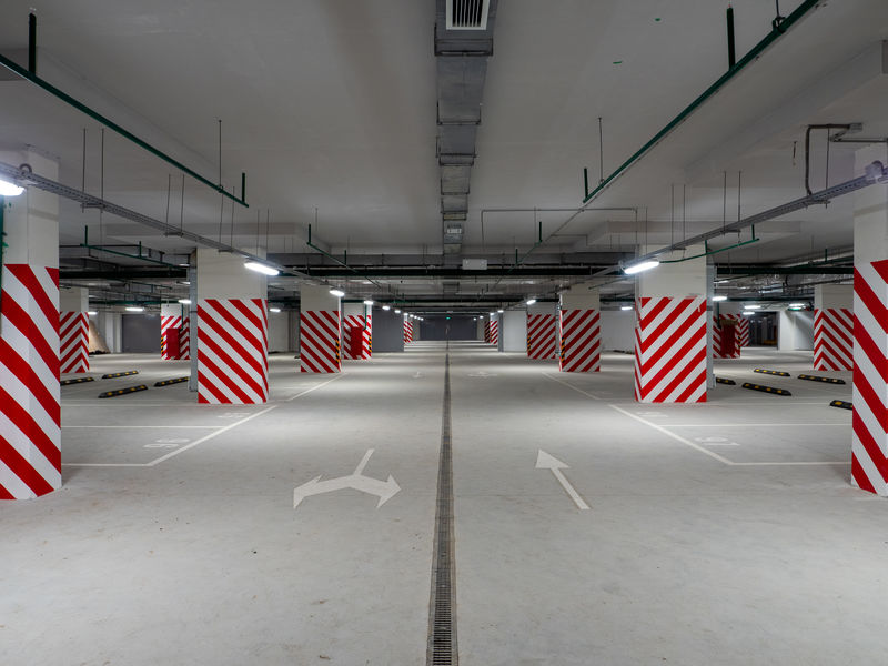 Ведется остекление первого этажа жилых секций витражными конструкциями. Подземный паркинг Квартала 4 подготовлен к финальным работам по нанесению разметки и нумерации машиномест.