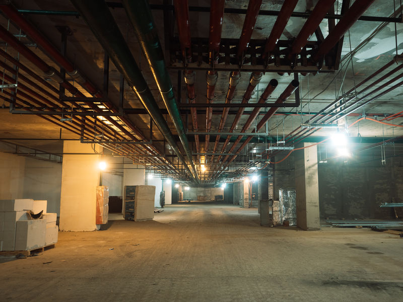 В подземном паркинге Квартала 5 прокладываются инженерные сети различного назначения, возводятся перегородки помещений.