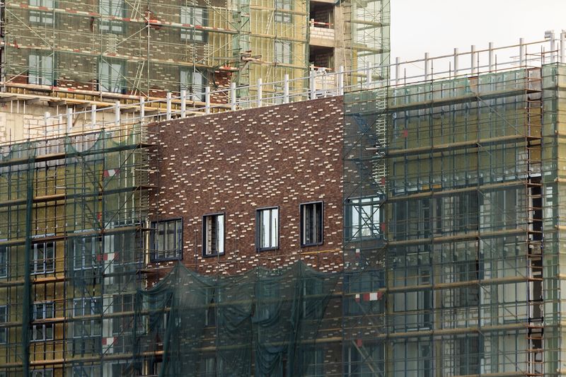В двух из трех секций будущего дома монтируется финишный фасад. Параллельно с ростом фасадных лесов, активно идут работы по остеклению и монтажу утеплителя.