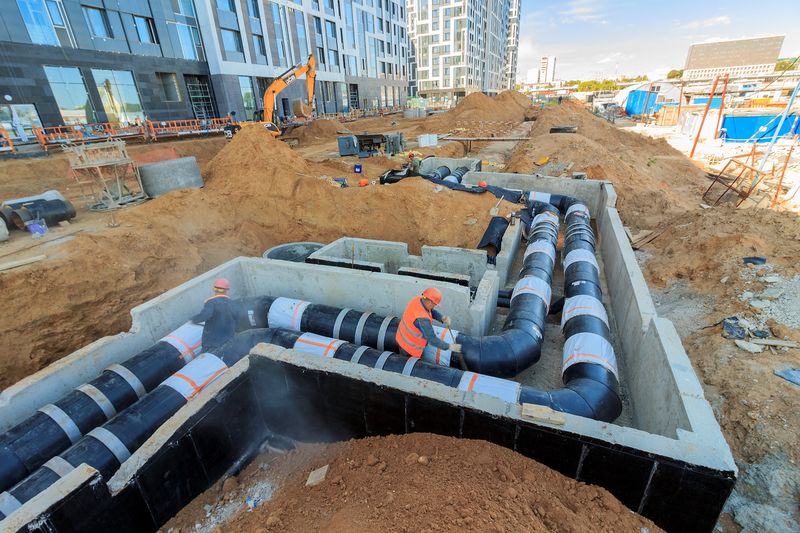 Осуществлены врезки по ряду будущих коммуникаций жилого дома. Продолжаются работы по прокладке внутриквартальных и подключению к внешним инженерным сетям. Полностью смонтированы все внутридомовые инженерные системы. Идет монтаж оконечных приборов.