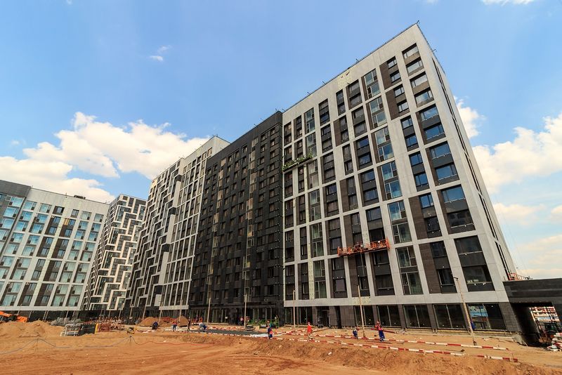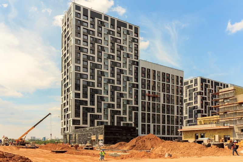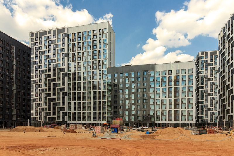 Фасадные работы в Квартале 2 практически полностью завершены. Жилые этажи, с отличающимся по задумке архитектора от секции к секции рисунком, закрывают панели из различных композитных материалов. Фасадная часть высокого первого этажа выполняется из натурального гранита индийского происхождения ABSOLUTE BLACK с матовой текстурой LEATHER, а также из архитектурного бетона.
