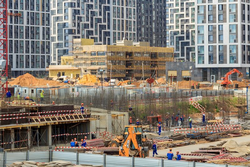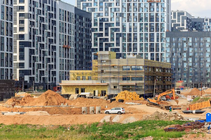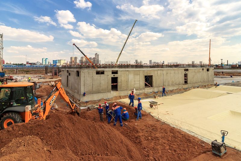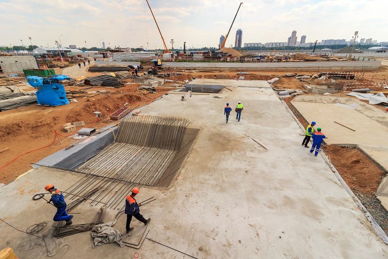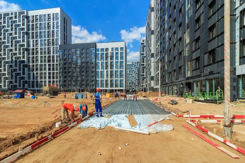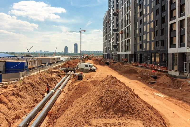 По периметру дома подходят к завершению работы по прокладке внешних инженерных сетей. Многие трубопроводы полностью готовы и опломбированы после испытаний. В рамках подготовки благоустройства дворовой и придомовой территории выполняются бетонные основания пожарных проездов и тротуаров. Осуществляется подсыпка для выравнивания уровня грунта.