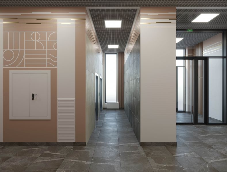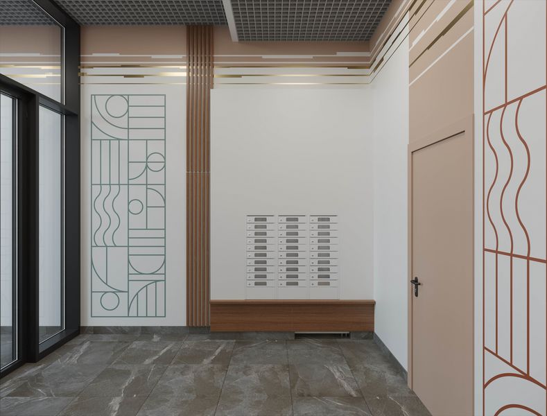 В финальном виде декоративная концепция предполагает оформление общественных зон с использованием геометрических орнаментов и современной графики. Динамичные элементы передают настроение и ритм большого города.