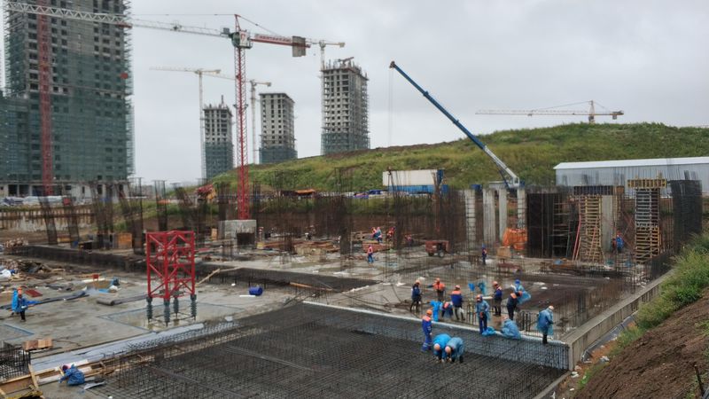 Стоит отметить, что в котловане продолжаются работы по формированию ростверка, гидроизоляции, армированию и заливке бетоном фундаментной плиты. Из подземной части здания вырастают первые вертикальные пилоны.